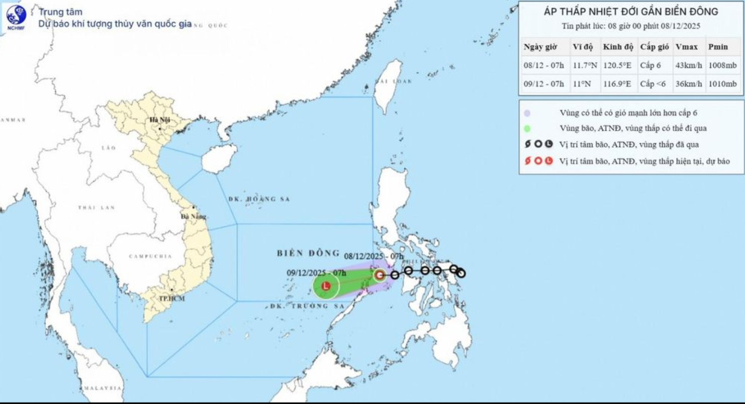 Theo ghi nhận mới nhất từ cơ quan khí tượng, tâm áp thấp nhiệt đới đang nằm gần khu vực phía Đông đảo Palawan. Sức gió mạnh nhất quanh tâm đạt cấp 6, giật cấp 8 – mức có thể gây nguy hiểm cho tàu thuyền hoạt động trên biển. Hệ thống này đang di chuyển theo hướng Tây với tốc độ khá nhanh, từ 15–20 km/h, và dự kiến đi vào vùng biển phía Nam Biển Đông trong thời gian ngắn tới. Đây là thời điểm người dân, đặc biệt là ngư dân và các đơn vị quản lý tàu thuyền, cần theo dõi sát diễn biến để chủ động ứng phó.