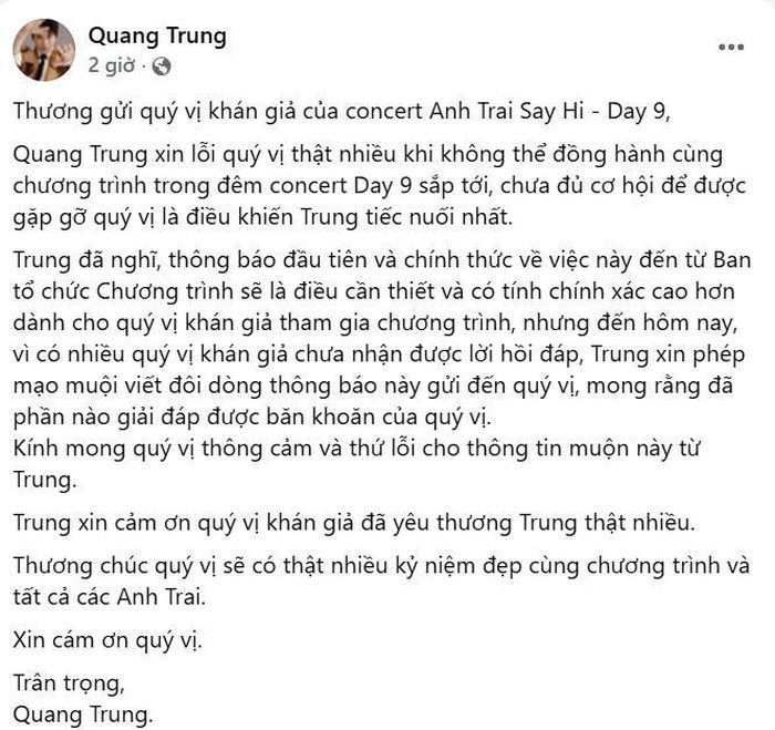 Trong chia sẻ đầy xúc động gửi đến người hâm mộ trên trang cá nhân, Quang Trung đã bày tỏ sự luyến tiếc sâu sắc: “Quang Trung xin lỗi quý vị thật nhiều vì không thể đồng hành cùng chương trình trong đêm concert Day 9 sắp tới. Việc chưa có đủ cơ hội để được gặp gỡ và biểu diễn cho quý vị là điều khiến Trung tiếc nuối nhất.” Lời bộc bạch chân thành này đã nhận được sự đồng cảm từ rất nhiều người xem.