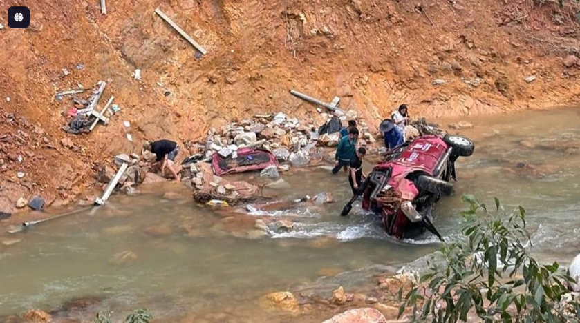Cú va chạm cực mạnh đã khiến xe bán tải bị hất văng qua lan can cầu và rơi xuống dòng suối bên dưới. Hình ảnh tại hiện trường cho thấy chiếc xe bán tải bị biến dạng hoàn toàn, gây ám ảnh cho những người chứng kiến.