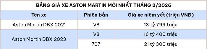 Lưu ý: Đây chỉ là giá tham khảo, giá chính thức có thể thay đổi tùy thuộc vào các yếu tố khác nhau. Để biết thông tin chi tiết về giá và các chương trình khuyến mãi, bạn nên liên hệ trực tiếp với các đại lý Aston Martin chính hãng.