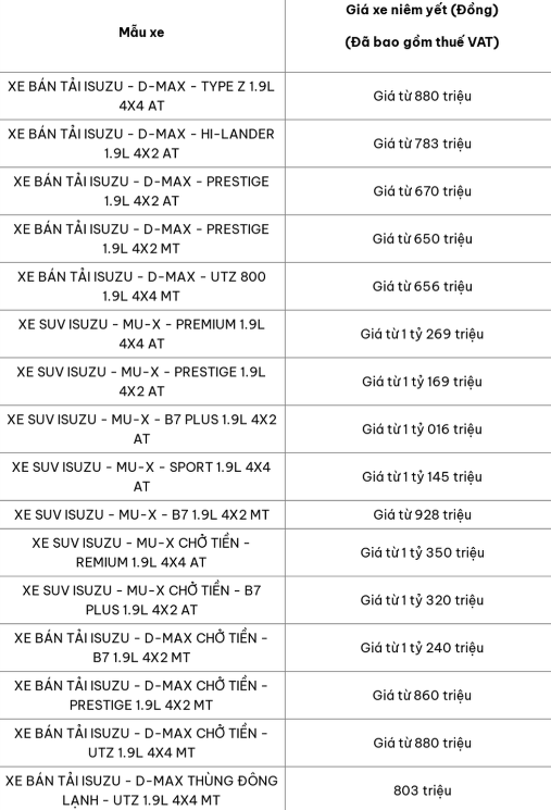 Bảng Giá Chi Tiết Các Dòng Xe Isuzu Tháng 10/2025