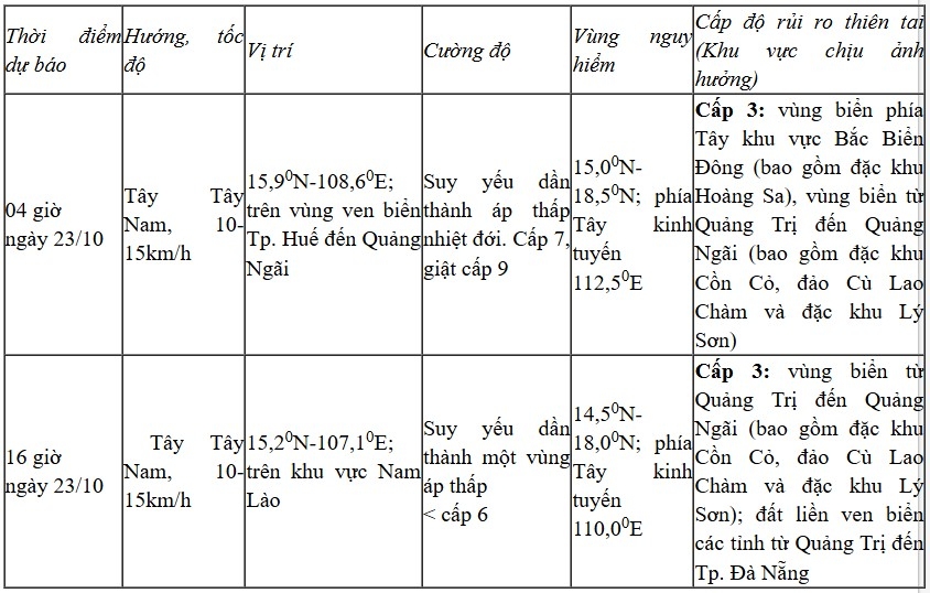 Do ảnh hưởng của hoàn lưu bão kết hợp với không khí lạnh tăng cường mạnh, từ chiều ngày 22/10, ven biển các tỉnh từ Quảng Trị đến Tp.Đà Nẵng có gió mạnh dần lên cấp 6, có lúc cấp 7, giật cấp 8-9. Mưa lớn kéo dài có thể gây ngập úng ở vùng trũng thấp và sạt lở đất ở vùng núi.