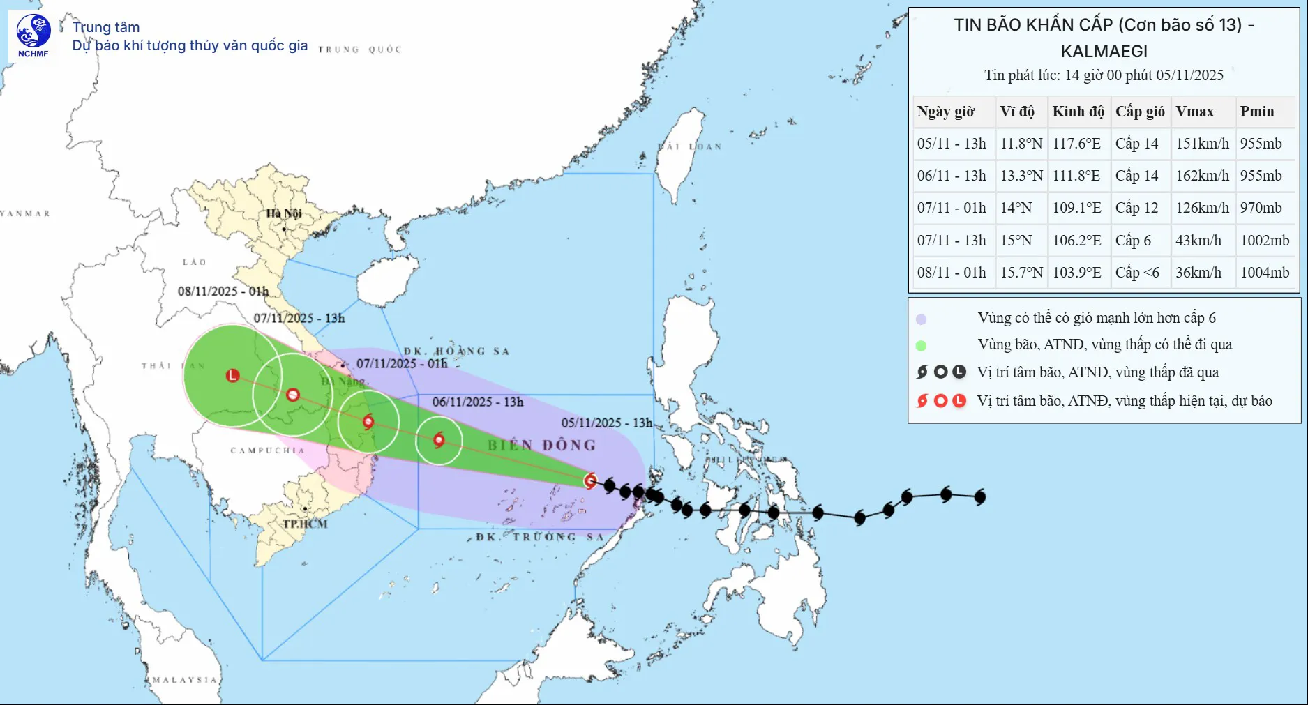 Theo thông tin mới nhất từ Trung tâm Dự báo Khí tượng Thủy văn Quốc gia, vào hồi 14 giờ ngày 5/11, vị trí tâm bão số 13 (Kalmaegi) ở vào khoảng 11.9 độ Vĩ Bắc; 117.4 độ Kinh Đông, cách đảo Song Tử Tây (thuộc đặc khu Trường Sa) khoảng 340km về phía Đông Đông Bắc. Sức gió mạnh nhất vùng gần tâm bão đạt cấp 13-14 (134-166km/h), giật cấp 17. Đây là một cơn bão có cường độ rất mạnh.