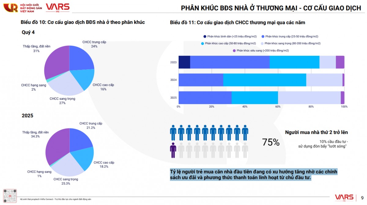 Tỷ lệ hấp thụ bình quân đối với nguồn cung mới đạt khoảng 68%, tương đương gần 88.000 giao dịch thành công, tăng 78% so với năm trước. Tuy nhiên, phần lớn giao dịch đến từ nhóm người mua nhà thứ hai trở lên, với mục đích đầu tư.