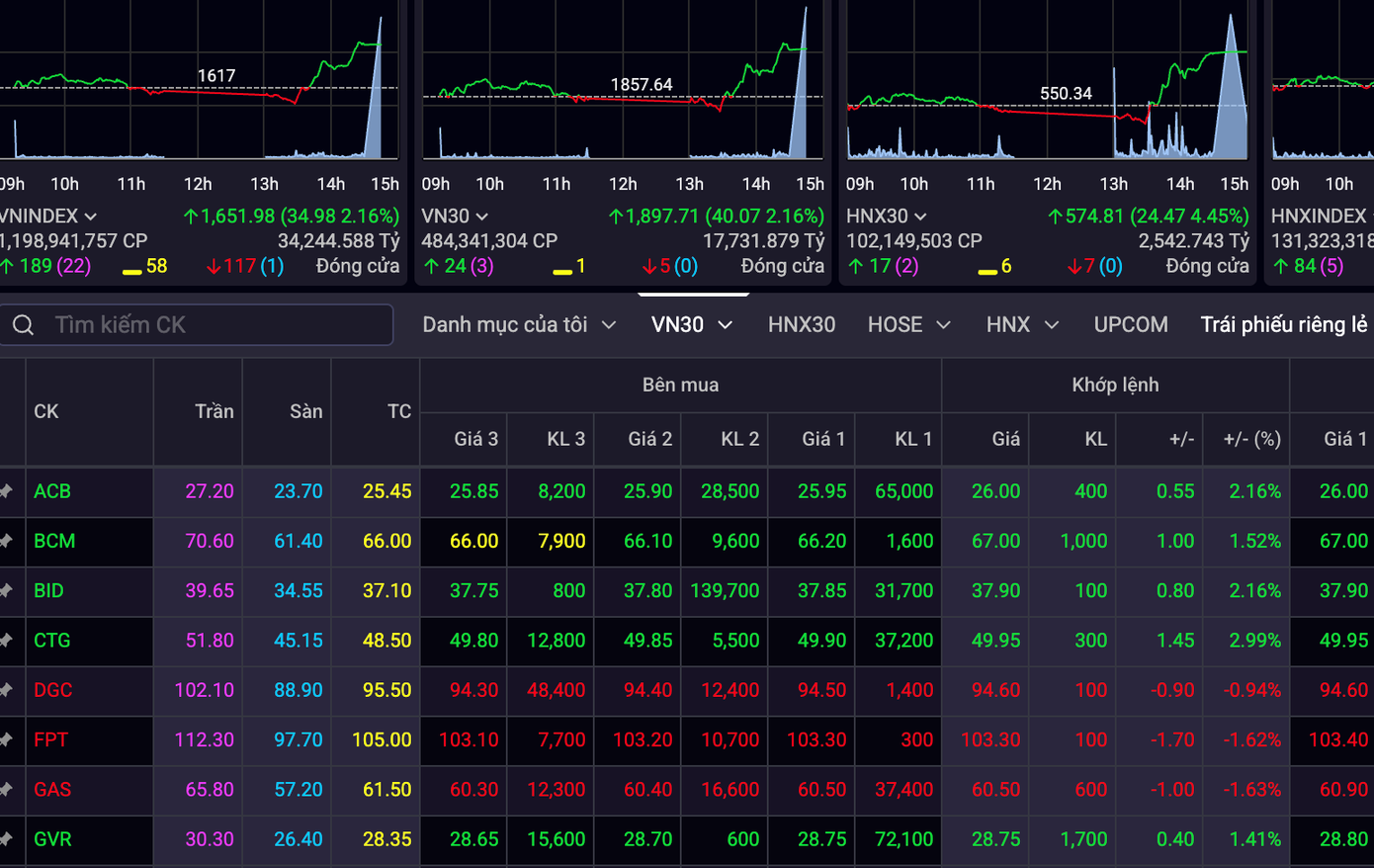 Sau hơn hai tuần chìm trong sắc đỏ, thị trường chứng khoán Việt Nam đã có một phiên giao dịch ngày 4/11 bùng nổ, với VN-Index tăng hơn 34 điểm, tương đương 2,12%, chạm mốc gần 1.652 điểm. Tâm điểm của sự phục hồi này chính là nhóm cổ phiếu bất động sản, với sắc xanh và tím lan tỏa khắp bảng điện tử. Có đến 46 mã tăng giá, 10 mã tăng trần, và chỉ 17 mã giảm, cho thấy sức hút mạnh mẽ của dòng tiền vào nhóm này.