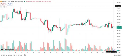 Tính đến sáng nay (27/12), giá Bitcoin đang giao dịch quanh mức 87.329 USD, nhích nhẹ 0,35% so với 24 giờ trước. Tuy nhiên, đừng vội mừng, vì thị trường vẫn còn nhiều yếu tố cần theo dõi sát sao.