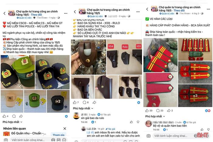 Chỉ cần vài thao tác tìm kiếm đơn giản trên các nền tảng mạng xã hội, bạn sẽ dễ dàng bắt gặp hàng loạt các tài khoản, fanpage hay hội nhóm công khai đang rao bán rầm rộ các mặt hàng được cho là “quân tư trang”. Từ những bộ quân phục đầy đủ trang phục xuân – hè, thu – đông, cho đến các phụ kiện đi kèm như mũ kê-pi, giày, thắt lưng, cầu vai, phù hiệu, thậm chí cả biển tên cũng có thể được tìm thấy.