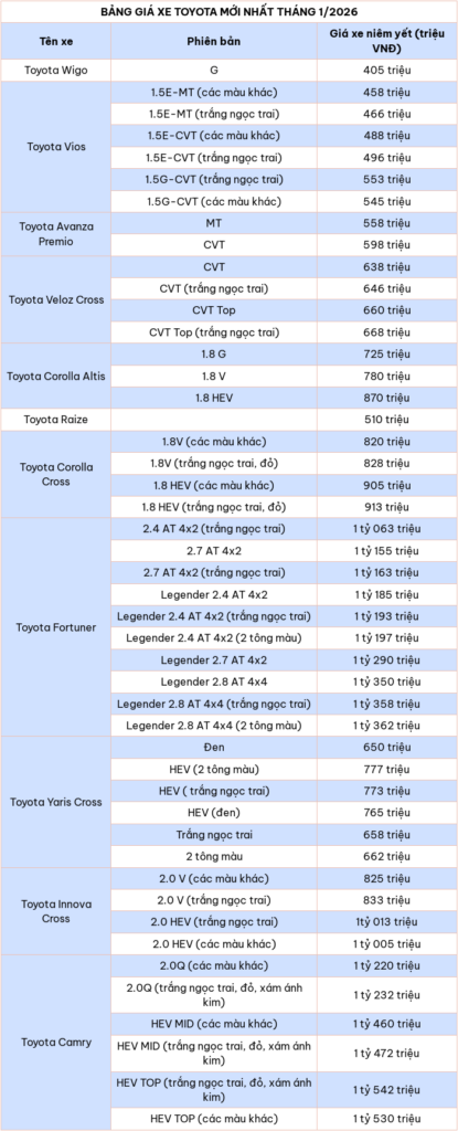 Khám phá bảng giá xe Toyota mới nhất 2026 tại Việt Nam! Tìm hiểu chi tiết về giá các dòng xe Wigo, Corolla Cross, Altis, Yaris Cross, Raize, Fortuner, Avanza Premio, Vios, Veloz Cross, Camry, Innova Cross để có lựa chọn phù hợp nhất.