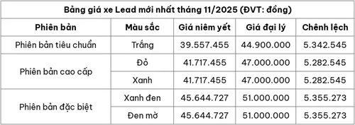Tin vui là giá niêm yết của Honda Lead trong tháng 11/2025 không có sự thay đổi so với tháng trước. Cụ thể như sau: