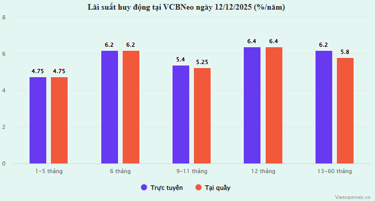 VCBNeo đã niêm yết lãi suất huy động kỳ hạn 1-5 tháng ở mức trần 4,75%/năm. Các kỳ hạn dài hơn vẫn được giữ nguyên, với mức cao nhất là 6,2%/năm cho kỳ hạn từ 12-60 tháng.
