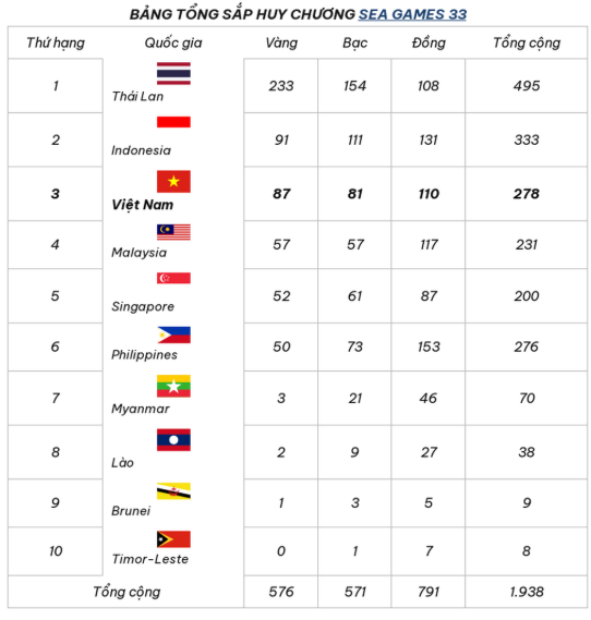 Tính đến tối ngày 20/12, Đoàn Thể thao Việt Nam giành được tổng 278 huy chương và đang tạm đứng vị trí thứ 3 trên bảng tổng sắp huy chương SEA Games 33, với thành tích ấn tượng gồm 87 Huy chương Vàng, 81 Huy chương Bạc và 110 Huy chương Đồng, tiếp tục khẳng định nỗ lực và bản lĩnh của thể thao Việt Nam trên đấu trường khu vực.