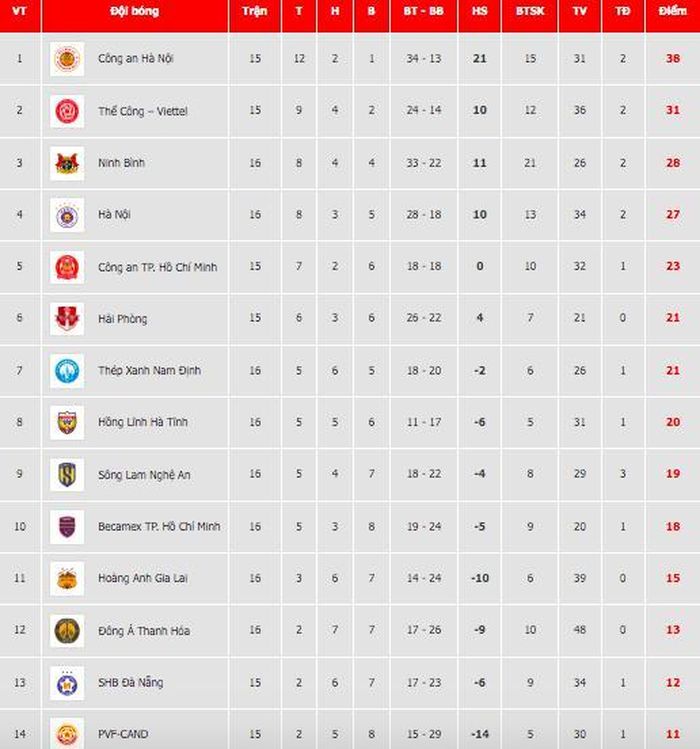 Sau vòng đấu này, CLB Công an Hà Nội đã chính thức vươn lên dẫn đầu bảng V-League 2025/26 với 38 điểm sau 15 trận. Khoảng cách 7 điểm với đội xếp thứ hai là Thể Công Viettel (31 điểm/15 trận) và 10 điểm với chính Ninh Bình FC (28 điểm/16 trận) là một lợi thế rất lớn. Trong một mùa giải mà tính cạnh tranh ngày càng cao, việc có được điểm số cách biệt như vậy sẽ giúp đội bóng giảm bớt áp lực trong các vòng đấu còn lại và có tâm lý thoải mái hơn để hướng tới mục tiêu cuối cùng. Đây là minh chứng cho sự ổn định và bản lĩnh của Công an Hà Nội.