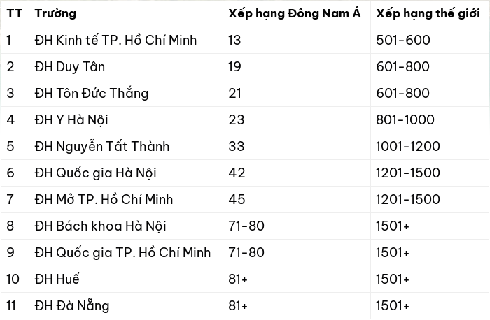 Bên cạnh đó, Đại học Bách khoa Hà Nội và Đại học Quốc gia TP. Hồ Chí Minh cùng chia sẻ vị trí từ 71 đến 80. Đại học Huế và Đại học Đà Nẵng nằm trong nhóm 81+. Mặc dù có thứ hạng thuộc nhóm sau, sự góp mặt của các trường này vẫn rất quan trọng. Chúng cho thấy bức tranh toàn cảnh của hệ thống giáo dục đại học Việt Nam, với những trường có lịch sử lâu đời và quy mô lớn, đang dần khẳng định lại vị thế của mình trong bối cảnh mới.