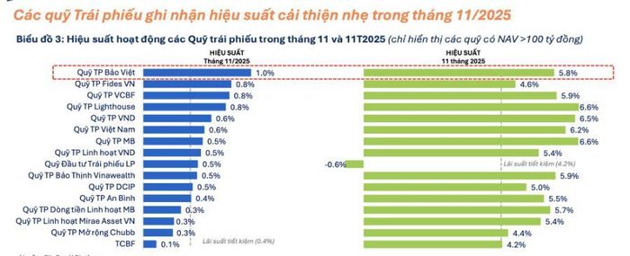 Hiệu suất của các quỹ trái phiếu trong tháng 11/2025 có sự cải thiện nhẹ lên 0,5% (so với 0,3% trong tháng 10). Quỹ Trái phiếu Bảo Việt (BVBF) nổi bật với hiệu suất +1%, mức cao nhất theo tháng trong năm, chủ yếu nhờ tăng tỷ trọng tiền gửi trong bối cảnh lãi suất cải thiện.