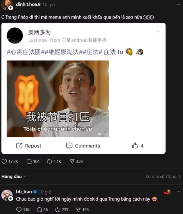 Giữa lúc cuộc tranh luận về chuyên môn và kết quả công diễn 1 “Đạp Gió 2026” đang nóng bỏng, một diễn biến bất ngờ đã xảy ra, khiến cộng đồng mạng Trung Quốc xôn xao. Đó chính là sự viral mạnh mẽ của chiếc meme “Tôi bị chương trình chèn ép” gắn liền với hình ảnh của BB Trần. Chiếc meme này nhanh chóng lan tỏa trên khắp các nền tảng mạng xã hội, từ Weibo đến Douyin, trở thành một hiện tượng văn hóa đại chúng.