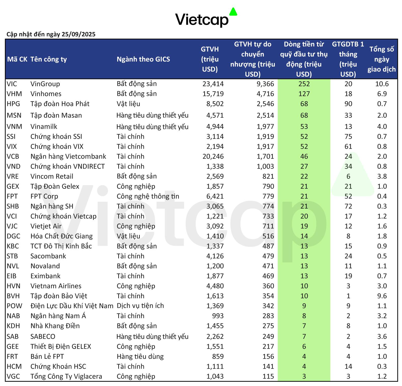 Dựa trên nghiên cứu của Vietcap, Việt Nam dự kiến sẽ có tỷ trọng 0,3% trong chỉ số FTSE Emerging Markets All Cap China A Inclusion Index, ngoài việc được đưa vào các chỉ số FTSE khác. Khoảng 30 cổ phiếu Việt Nam sẽ được bổ sung vào danh mục đầu tư của các quỹ chỉ số. Dòng vốn từ các quỹ thụ động có thể đạt ít nhất 1 tỷ USD trong quá trình thực hiện. FTSE Russell sàng lọc các cổ phiếu đủ điều kiện dựa trên các tiêu chí khác nhau như yêu cầu về tỷ lệ sở hữu nước ngoài tối thiểu, quy mô, thanh khoản và tỷ lệ chuyển nhượng tự do (được xem xét hàng quý; bất kỳ tiêu chí nào bị vi phạm có thể bị loại khỏi chỉ số).