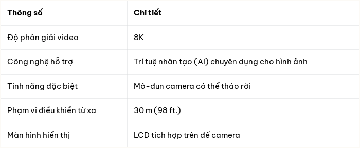 Để hiểu rõ hơn về khả năng của Dreame Leaptic Cube 8K, chúng ta hãy cùng điểm qua một số thông số kỹ thuật quan trọng: (Thông tin này nên được lấy từ nguồn chính thức của Dreame khi có sẵn, ví dụ như độ phân giải video, tốc độ khung hình, góc quay, dung lượng pin, khả năng chống nước,…)