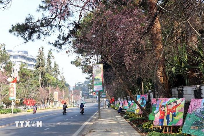 Hoa mai anh đào luôn là biểu tượng của Đà Lạt mỗi độ xuân về. Trên “Đường hoa ánh sáng”, hàng mai anh đào khoe sắc rực rỡ, tạo nên một khung cảnh vô cùng lãng mạn và thơ mộng. Những cánh hoa mỏng manh, hồng phớt rung rinh trong gió, khiến ai ngắm nhìn cũng phải xao xuyến.