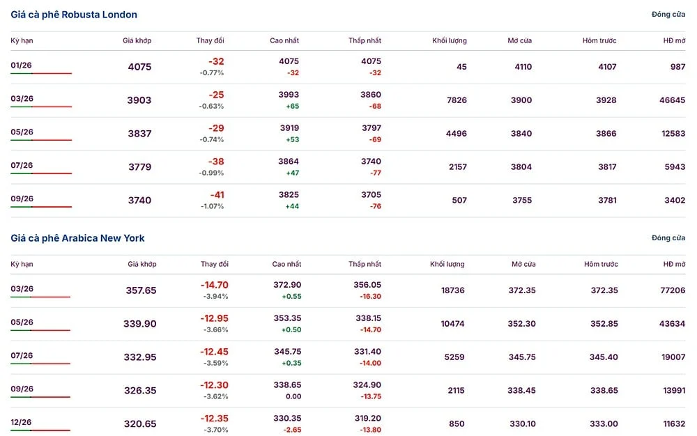 Giá cà phê Robusta trên sàn London giao tháng 1/2026 duy trì ở mức 4.075 USD/tấn, trong khi kỳ hạn giao tháng 3/2026 không đổi, ở ngưỡng 3.903 USD/tấn. Giá cà phê Robusta được đánh giá là tương đối ổn định so với các biến động gần đây.