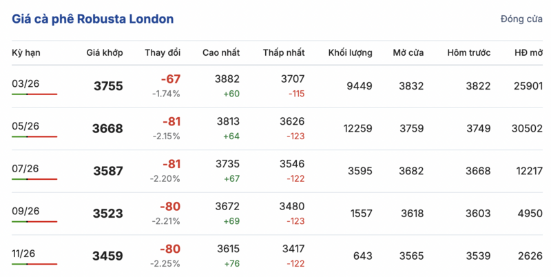 Giá cà phê Robusta trên sàn London tiếp tục trải qua một phiên giảm sâu vào ngày 9/2/2026. Các kỳ hạn giao hàng đều ghi nhận mức giảm đáng kể, phản ánh áp lực bán ra gia tăng trên thị trường. Điều này có thể là do lo ngại về nguồn cung hoặc những yếu tố kinh tế vĩ mô khác.
