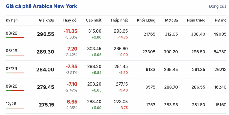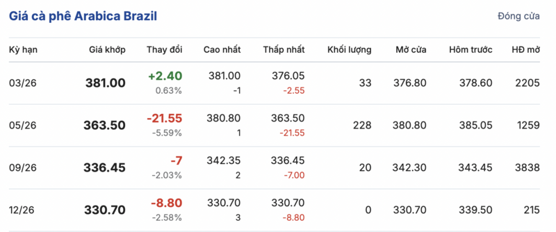 Trái ngược với xu hướng chung, giá cà phê Arabica Brazil lại ghi nhận những biến động trái chiều. Kỳ hạn giao tháng 3/2026 tăng nhẹ, trong khi kỳ hạn tháng 12/2026 lại giảm mạnh. Sự phân hóa này có thể do những yếu tố đặc thù của thị trường Brazil, như tình hình thu hoạch và nhu cầu nội địa.