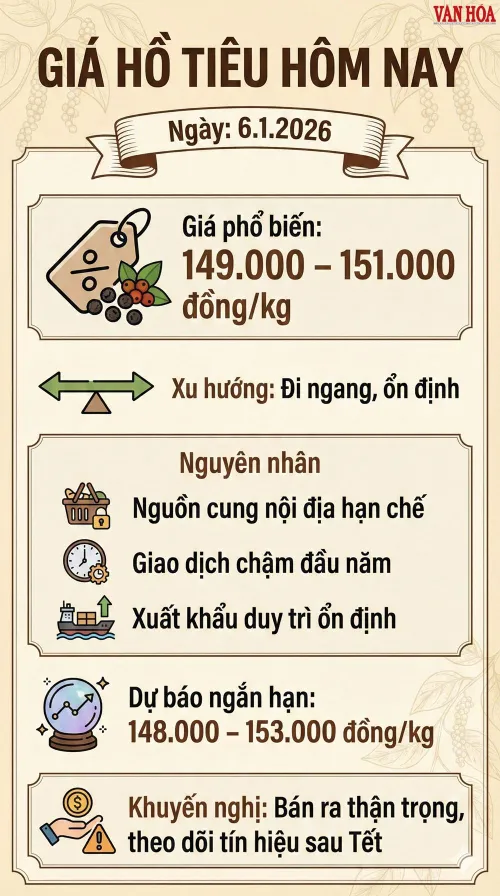 Cập nhật nhanh chóng và chính xác nhất về giá hồ tiêu ngày 6.1.2026. Phân tích chuyên sâu về tình hình thị trường, dự báo xu hướng và lời khuyên hữu ích cho người trồng tiêu và thương lái. Theo dõi ngay để không bỏ lỡ thông tin quan trọng!