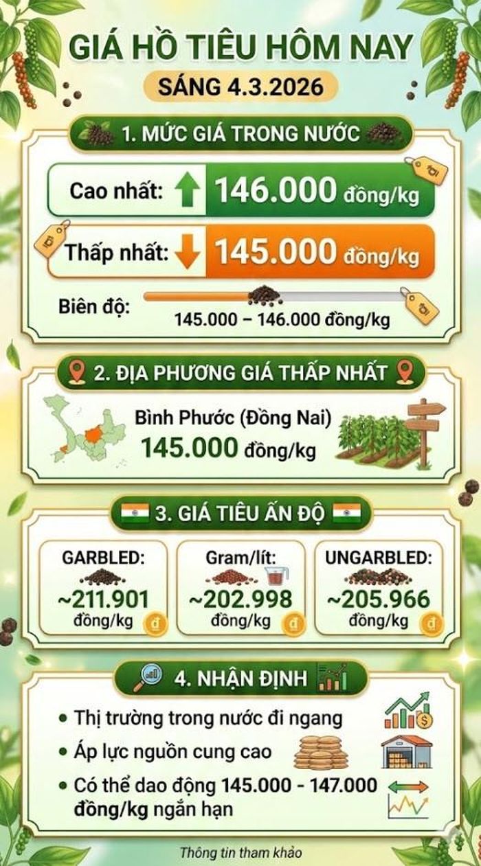 Cập nhật giá hồ tiêu ngày 4/3/2026: Thị trường trong nước tiếp tục neo ở vùng thấp, giá phổ biến 145.000 – 146.000 đồng/kg. Thị trường thế giới đi ngang, dự báo xu hướng sắp tới.