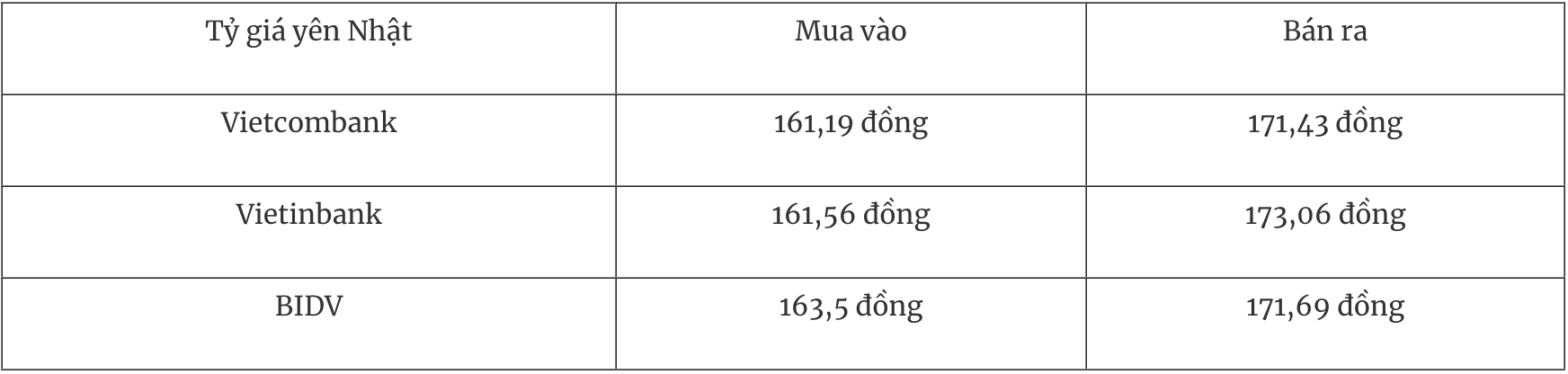 Đối với đồng Yên Nhật (JPY), tỷ giá tại Sở giao dịch NHNN hiện vẫn giữ nguyên ở mức 153 đồng – 169 đồng. Tuy nhiên, các ngân hàng thương mại có thể có những điều chỉnh nhỏ trong biên độ mua vào và bán ra. Xu hướng ngắn hạn của JPY sẽ phụ thuộc nhiều vào chính sách tiền tệ của Ngân hàng Trung ương Nhật Bản (BOJ) và tâm lý nhà đầu tư toàn cầu.