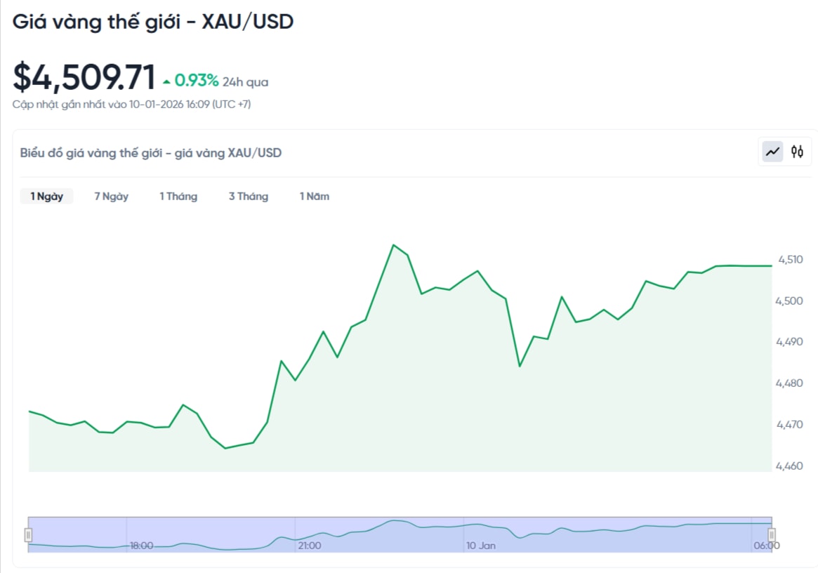Theo Kitco, giá vàng thế giới giao ngay đạt mức 4509,71 USD/ounce vào lúc 4h00 ngày 11/1 (giờ Việt Nam), tăng 41,53 USD/ounce so với phiên trước. Quy đổi theo tỷ giá USD tại Vietcombank, giá vàng thế giới tương đương khoảng 143,47 triệu đồng/lượng (chưa tính thuế, phí). Như vậy, giá vàng miếng SJC đang cao hơn giá vàng quốc tế khoảng 16,33 triệu đồng/lượng.