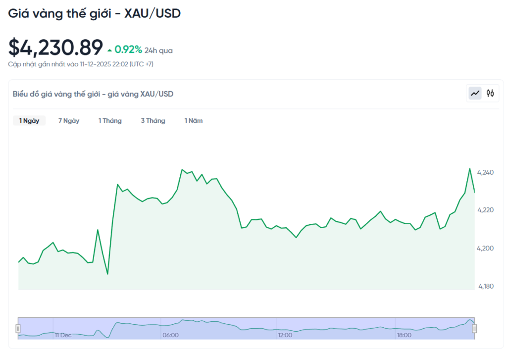 Theo Kitco, giá vàng thế giới ghi nhận lúc 4h00 ngày 12/12/2025 (giờ Việt Nam) ở mức 4230,89 USD/ounce, tăng 38,65 USD/Ounce so với hôm qua. Quy đổi theo tỷ giá Vietcombank, giá vàng thế giới khoảng 134,7 triệu đồng/lượng (chưa tính thuế, phí). Điều này cho thấy giá vàng miếng SJC đang cao hơn vàng quốc tế khoảng 19,5 triệu đồng/lượng.