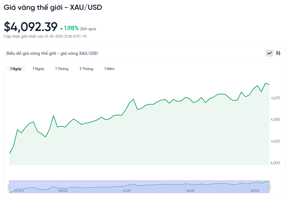 Không chỉ thị trường vàng trong nước, giá vàng thế giới cũng đang có những diễn biến rất đáng chú ý. Theo Kitco, giá vàng thế giới giao ngay lúc 4h00 ngày 14/10/2025 đã đạt mức 4092,39 USD/ounce, tăng 79,58 USD/ounce so với ngày hôm qua. Đây là một con số ấn tượng, cho thấy giá vàng thế giới đang trên đà tăng trưởng mạnh mẽ.