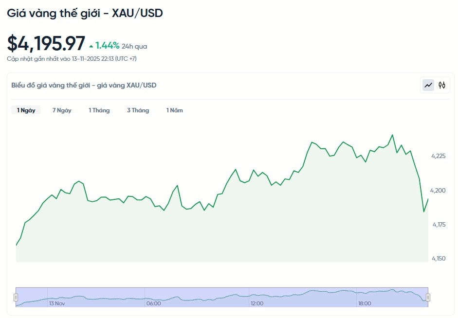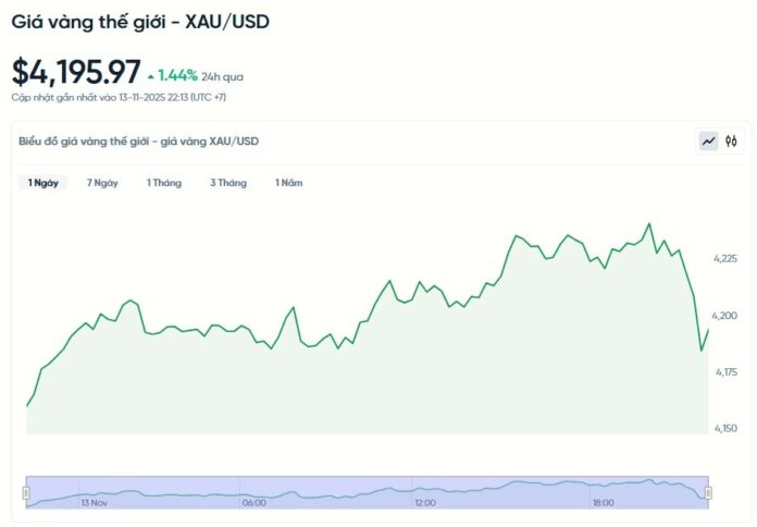 Chúng ta hãy cùng nhìn ra thế giới để xem giá vàng thế giới đang diễn biến như thế nào nhé. Theo Kitco, giá vàng thế giới giao ngay lúc 4h00 ngày 14/11/2025 đang ở mức 4195,97 USD/ounce, tăng 59,6 USD/ounce so với hôm qua. Quy đổi theo tỷ giá USD tại Vietcombank, giá vàng thế giới tương đương khoảng 133,5 triệu đồng/lượng (chưa tính thuế, phí). Điều này cho thấy giá vàng miếng trong nước đang cao hơn giá vàng quốc tế khoảng 21 triệu đồng/lượng.