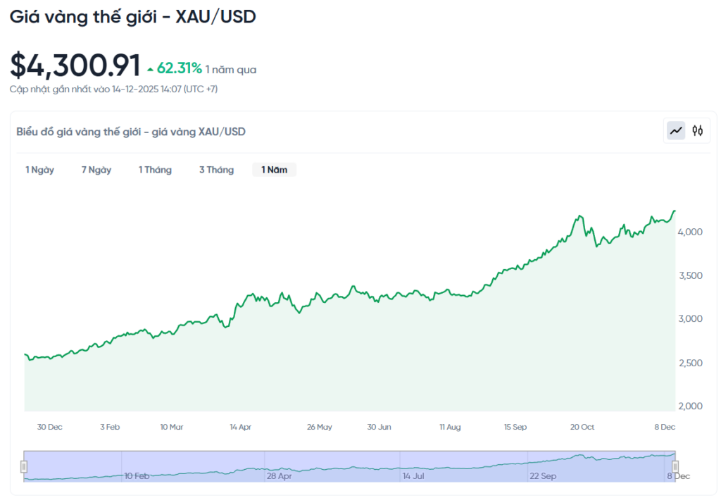 Tính đến 4h00 ngày 15/12/2025 (giờ Việt Nam), giá vàng thế giới giao ngay ở mức 4.300,91 USD/ounce. Trong năm 2025, giá vàng đã tăng mạnh 1651,14 USD/ounce (62,31%). Quy đổi theo tỷ giá USD tại ngân hàng Vietcombank (26.405 VND/USD), vàng thế giới có giá khoảng 136,9 triệu đồng/lượng (chưa tính thuế, phí).