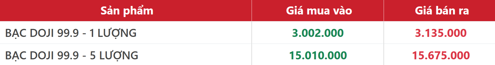 DOJI cũng ghi nhận sự điều chỉnh giảm cho sản phẩm bạc. Giá bạc DOJI 99.9 loại 1 lượng hiện ở mức 3,002 – 3,135 triệu đồng/lượng, giảm 73.000 đồng/lượng ở chiều mua vào và giảm 76.000 đồng/lượng ở chiều bán ra.