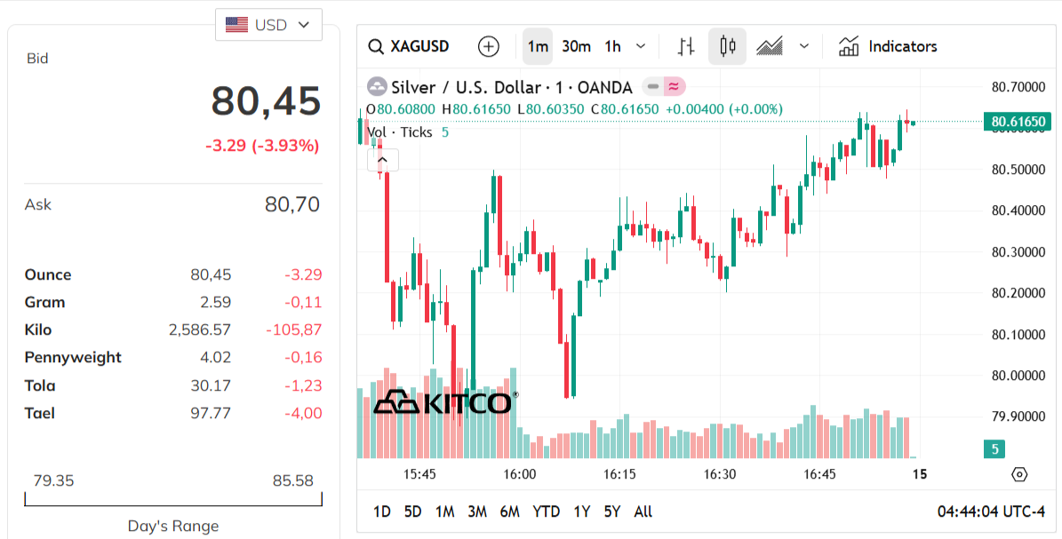 Trong phiên mới nhất, giá bạc giao ngay đã giảm 3,93%, xuống còn khoảng 80,45 USD/ounce. Đây là một trong những phiên giảm đáng chú ý của thị trường kim loại quý.