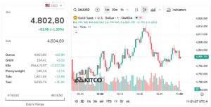 Theo thông tin từ Kitco, giá vàng thế giới giao ngay vào lúc 4h00 ngày 15/4/2026 (giờ Việt Nam) đã chạm mốc 4802,8 USD/ounce, đánh dấu mức tăng 62,9 USD, tương đương 1,33% so với phiên giao dịch trước đó. Sự tăng trưởng này đã đưa giá vàng thế giới lên một tầm cao mới, ảnh hưởng trực tiếp đến thị trường vàng trong nước.