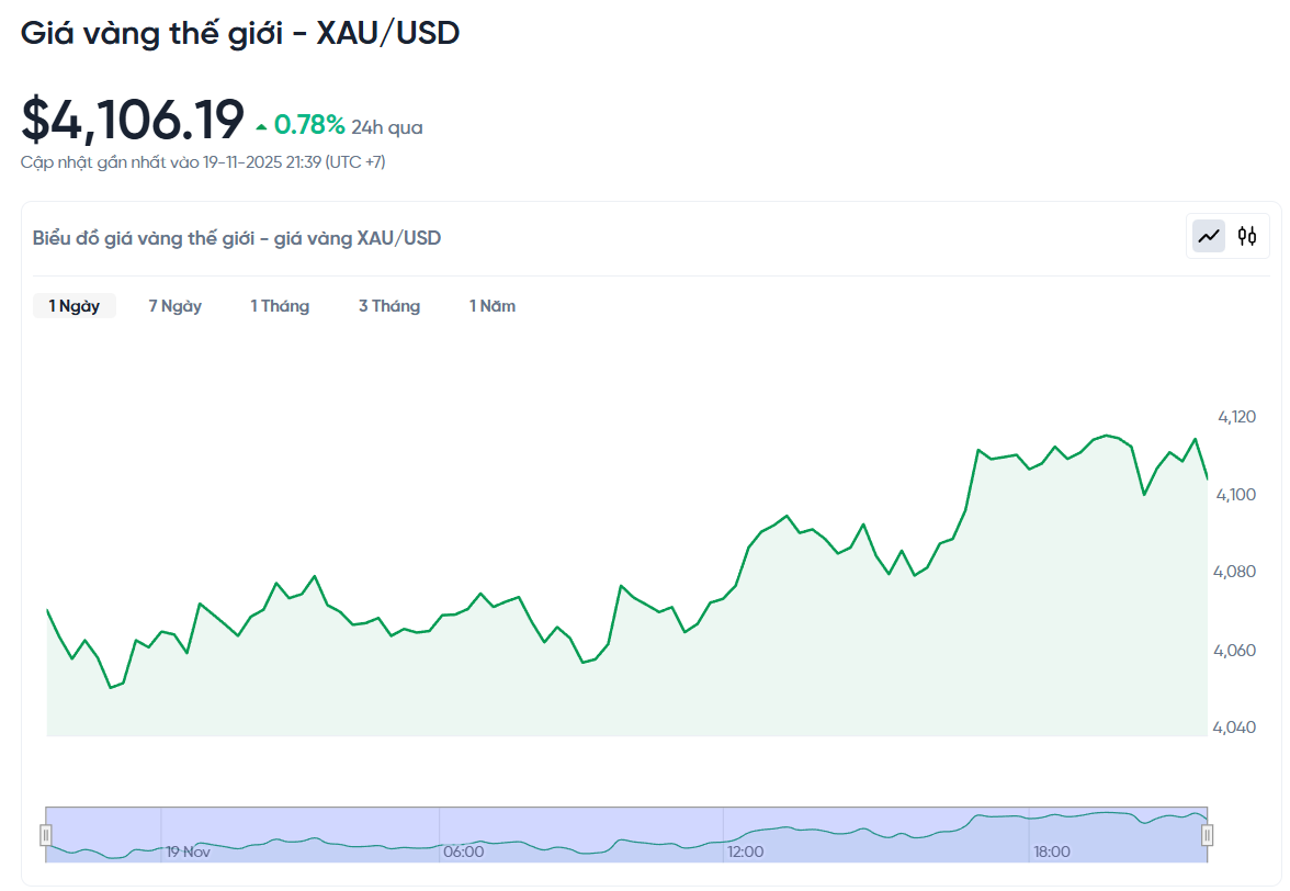 Theo Kitco, giá vàng giao ngay lúc 4h00 sáng nay đạt 4.106,19 USD/ounce, tăng 31,7 USD so với hôm qua. Hợp đồng tương lai vàng Mỹ kỳ hạn tháng 12 cũng tăng 1,2%, lên 4.116,50 USD/ounce.