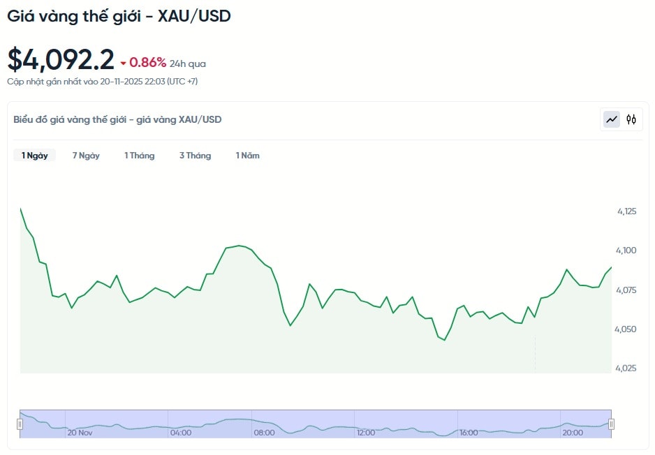 Trên thị trường quốc tế, giá vàng thế giới ghi nhận sự phục hồi nhẹ vào ngày 21/11/2025. Theo Kitco, giá vàng giao ngay đạt mức 4092,2 USD/ounce, tăng 35,51 USD/ounce so với ngày hôm qua. Sự phục hồi này có thể do một số yếu tố, bao gồm sự suy yếu của đồng đô la Mỹ, căng thẳng địa chính trị gia tăng hoặc sự thay đổi trong kỳ vọng về chính sách tiền tệ của Cục Dự trữ Liên bang Mỹ (Fed).