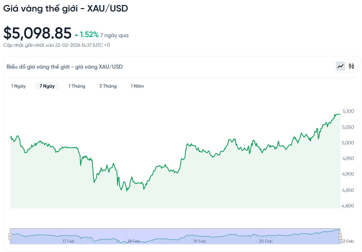 Cuối tuần (phiên 21/2): Giá vàng có một phiên bùng nổ ấn tượng, tăng vọt từ 4.999 USD lên đỉnh 5.108 USD/ounce trước khi chốt phiên ở mức 5.098,85 USD. Sự tăng giá mạnh mẽ này cho thấy sức hấp dẫn của vàng trong vai trò là “hầm trú ẩn an toàn” của thị trường tài chính toàn cầu.