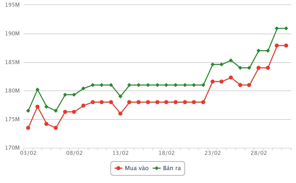 Phú Quý cũng không đứng ngoài xu thế đi lên mạnh mẽ này. Mở đầu phiên giao dịch ngày 3/3, doanh nghiệp đã nâng giá mua lên 187,9 triệu đồng/lượng và giá bán ra lên 190,9 triệu đồng/lượng, cùng mức tăng 3,9 triệu đồng/lượng so với phiên trước đó. Sự đồng loạt tăng giá này cho thấy một tín hiệu mạnh mẽ từ thị trường.