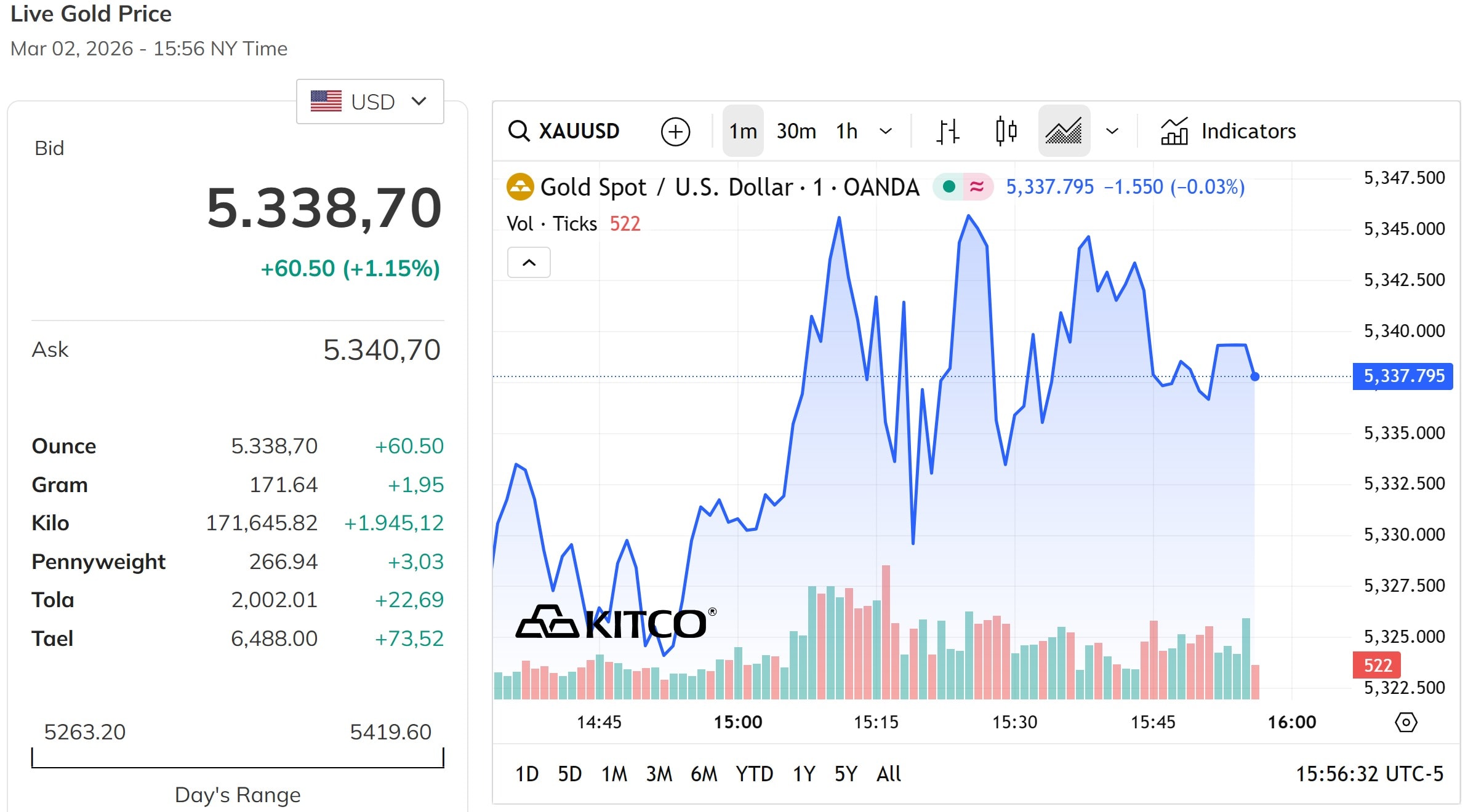 Cập nhật lúc 04h00 ngày 3/3/2026 (giờ Việt Nam), giá vàng thế giới giao ngay đã có một phiên giao dịch đầy khởi sắc, đạt mức 5.338,7 USD/ounce. Ghi nhận mức tăng ấn tượng 60,5 USD/ounce so với ngày hôm trước, đà tăng này đã đưa vàng thế giới vượt qua mốc 5.300 USD/ounce, một ngưỡng kháng cự quan trọng.