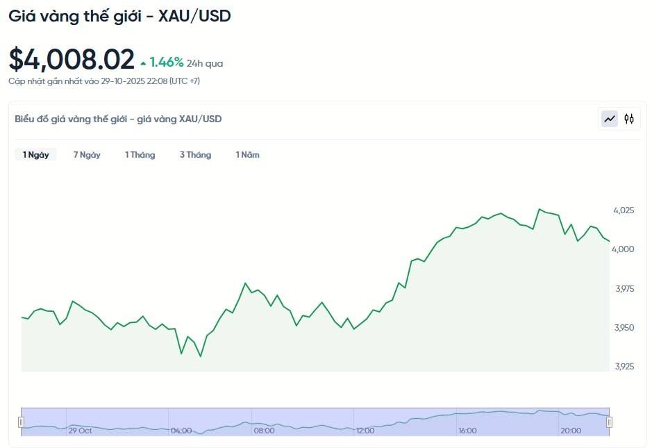 Giá vàng thế giới ghi nhận mức tăng ấn tượng, vượt ngưỡng 4000 USD/ounce. Điều này cho thấy vàng vẫn là kênh trú ẩn an toàn trong bối cảnh kinh tế toàn cầu nhiều biến động.