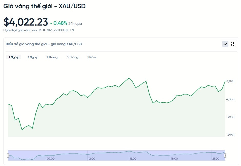 Trên thị trường thế giới, giá vàng giao ngay đã tăng 19,08 USD/ounce, đạt mức 4022,23 USD/ounce. Sự tăng trưởng này có thể do nhiều yếu tố tác động, bao gồm tình hình kinh tế toàn cầu, chính sách tiền tệ của các ngân hàng trung ương, và biến động của đồng USD.