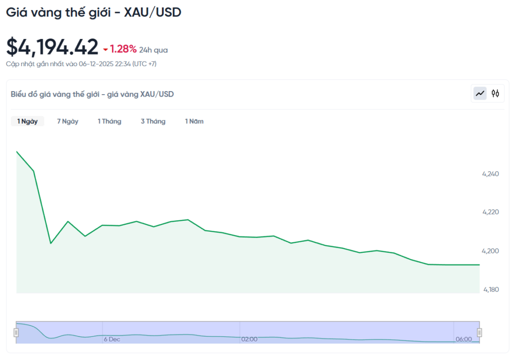 - Giá vàng thế giới chốt phiên 6/12 ở mức 4.194,42 USD/ounce, giảm tới 54,3 USD/ounce.