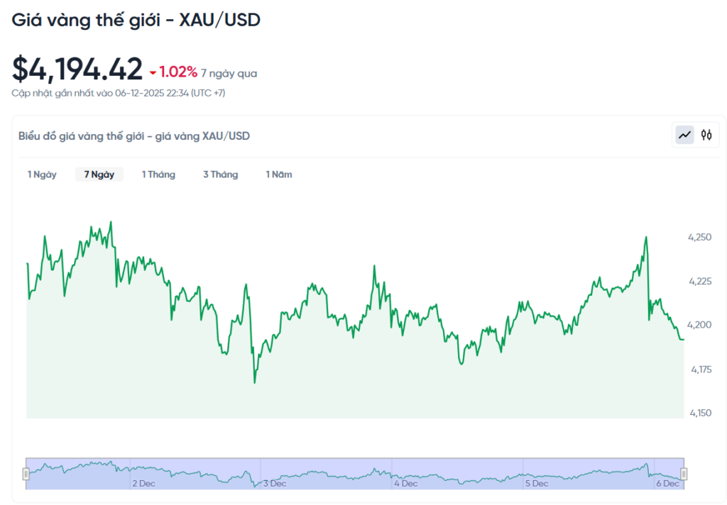 Theo Kitco, giá vàng thế giới giao ngay lúc 4h00 ngày 8/12/2025 đạt 4.194,42 USD/ounce, giảm 43,4 USD/ounce so với tuần trước. Đây là mức giảm sau chuỗi biến động mạnh từ cuối tháng 11, khi thị trường liên tục điều chỉnh theo kỳ vọng lãi suất của Mỹ.