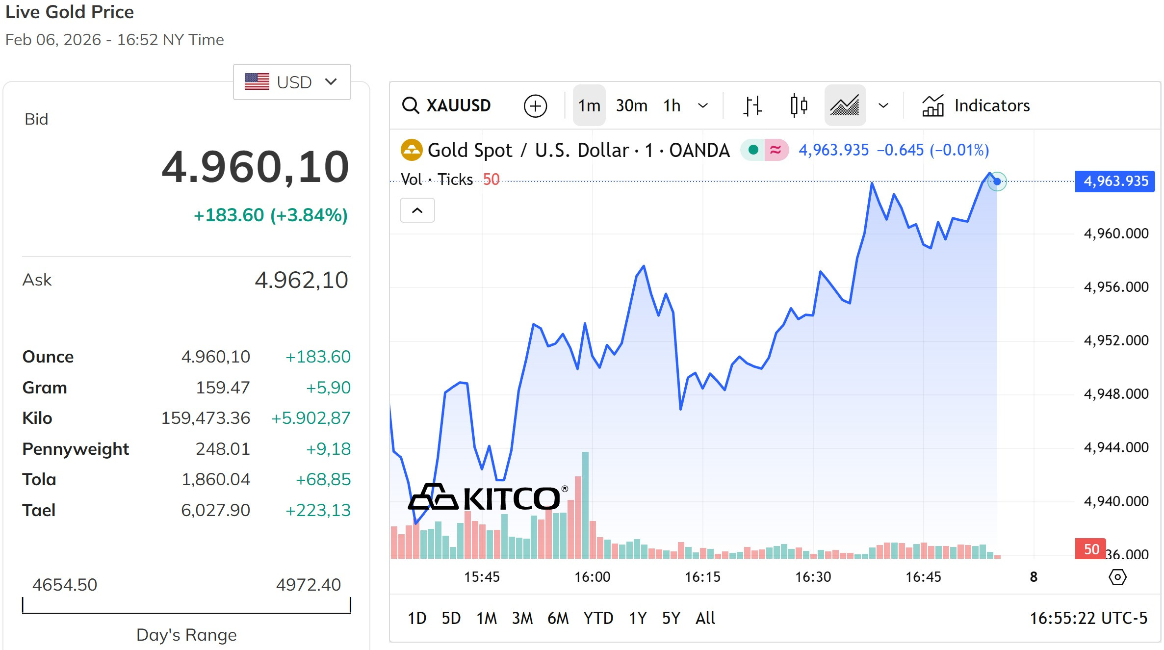 Giá vàng thế giới giao ngay mức 4.960,1 USD/ounce. Ghi nhận tăng 183,6 USD/ounce so với ngày hôm qua. Quy đổi theo tỷ giá USD tại ngân hàng Vietcombank (26.150 VND/USD), vàng thế giới có giá khoảng 156,4 triệu đồng/lượng (chưa tính thuế, phí).