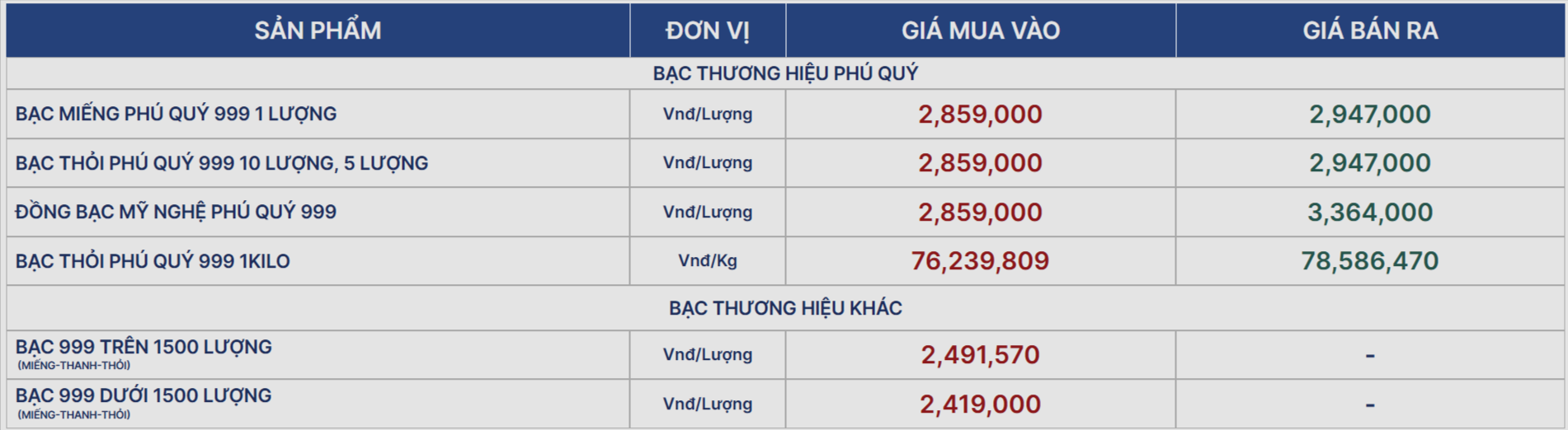 Giá bạc Phú Quý đảo chiều tăng