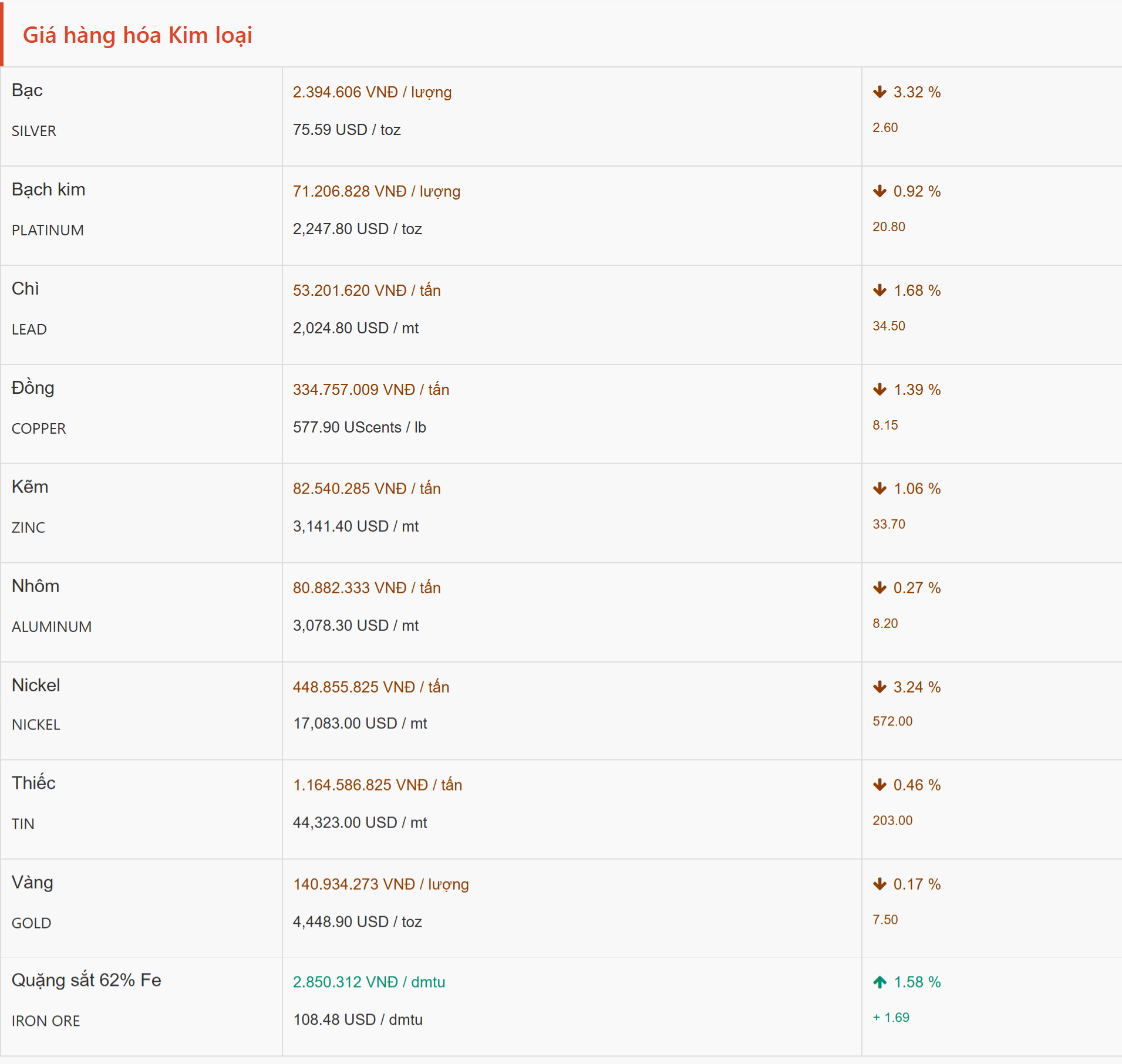 Diễn biến giá các kim loại khác