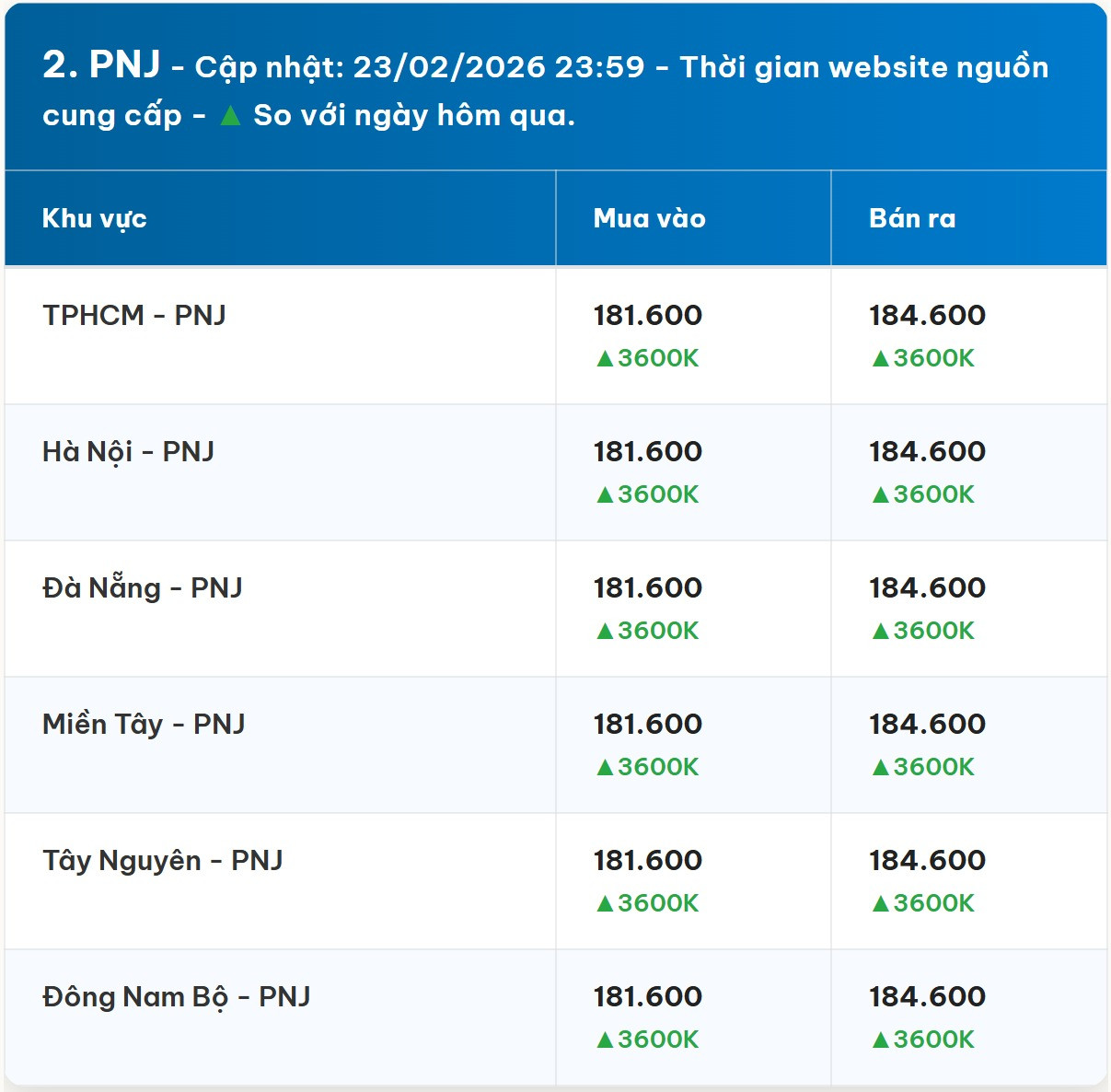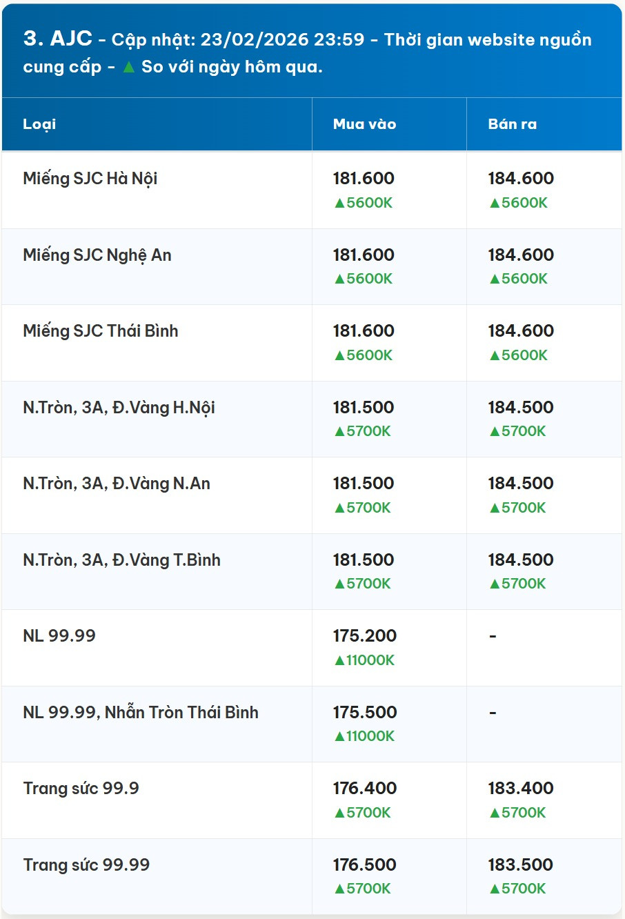Bên cạnh vàng miếng SJC, vàng nhẫn trơn 9999 cũng đang chứng tỏ sức hút không hề kém cạnh trên thị trường. Đặc biệt, vào ngày 24/02/2026, dòng sản phẩm này đã vượt qua ngưỡng 184 triệu đồng/lượng, cho thấy sự quan tâm lớn từ phía người tiêu dùng.
