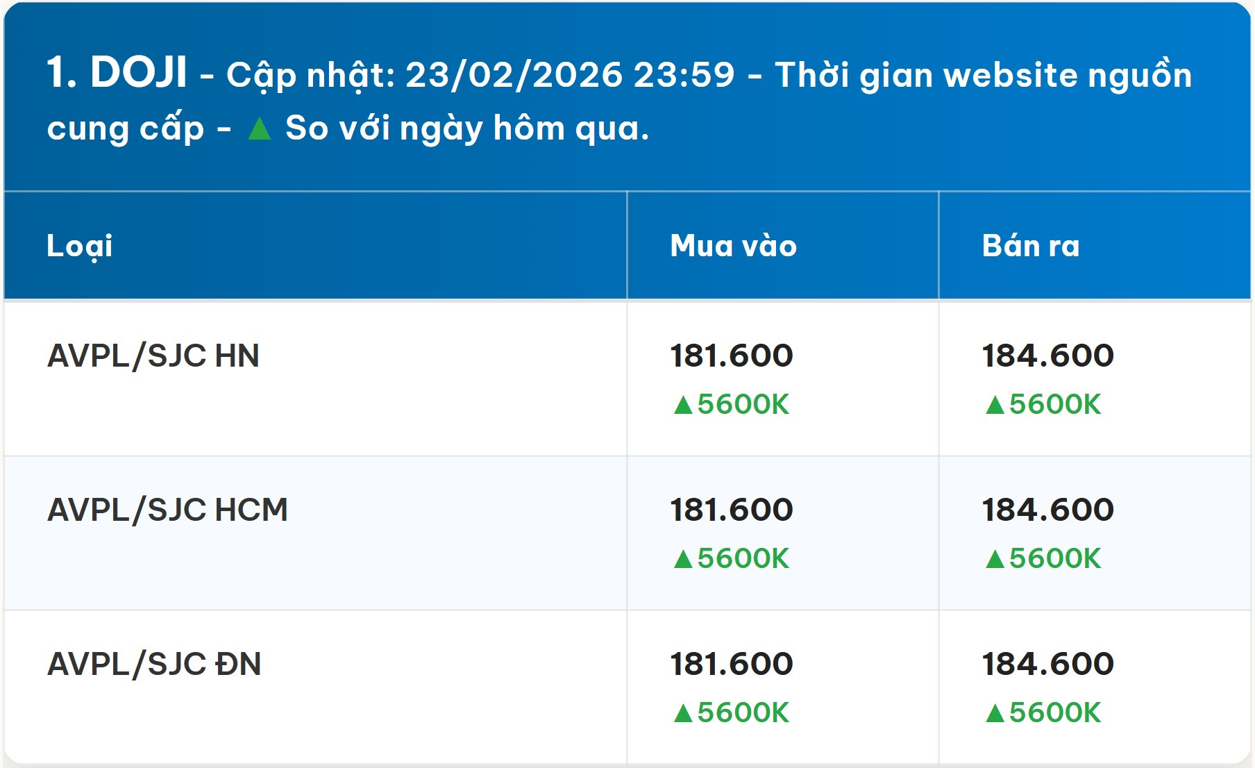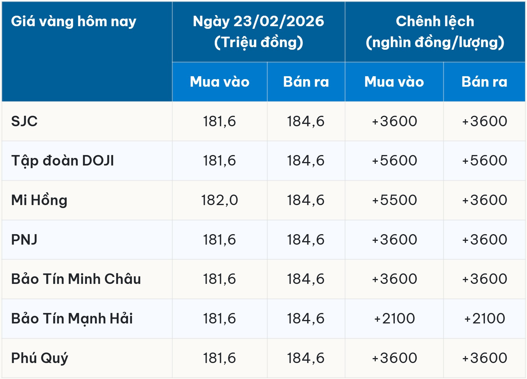 Đáng chú ý, Mi Hồng lại chọn cho mình một hướng đi riêng biệt vào sáng sớm ngày 24/02. Với mức tăng tới 5,5 triệu đồng/lượng, giá mua vào tại Mi Hồng được niêm yết ở mức 182 triệu đồng/lượng, cao hơn đáng kể so với nhiều đơn vị khác. Trong khi đó, giá bán ra chốt phiên ở mức 184,6 triệu đồng/lượng. Sự khác biệt này có thể đến từ chiến lược kinh doanh hoặc lượng hàng tồn kho của từng doanh nghiệp. Việc so sánh giá vàng hôm nay 24/02/2026 giữa các nhà cung cấp sẽ giúp nhà đầu tư có cái nhìn đa chiều hơn.
